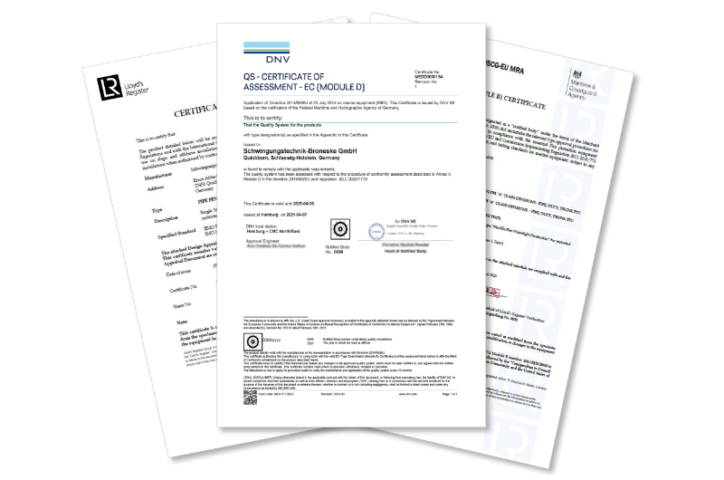 The SB Broneske flexible fire-watertight penetration is certified with an European MED A-60, US Coastguard, Lloyd's Register EC Type Examination, DNV GL QS - Certificate of Assessment and ABS Design Approval. Any other certificates are available on request.